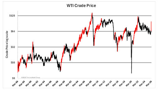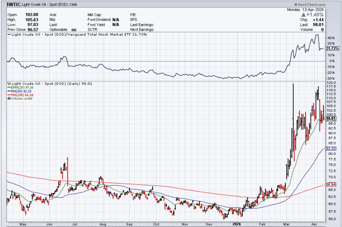 They say a picture is worth a thousand words, so look below at the chart of Crude Oil, which has spiked nearly 50% since February 27, the day before the United States attacked Iran.