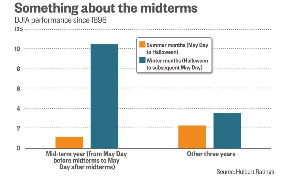 What the finance professors found is that pretty much the entire edge of the best six months strategy was only statistically relevant during mid-term election years. The stock market performs on average more than 9% better in the six months after the November midterms than in the six months before. In the other three years of the cycle, though, this edge is only 1.3%, which is pretty meaningless.