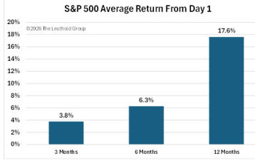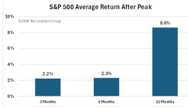 Finally, the chart below plots the average gain in the S&P 500 for the 3-, 6- and 12-month periods after the peak oil price is attained. This, of course, can only be known in hindsight.