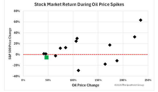 The oil price spikes are denoted by the red segments in the chart. Opsal found the average duration of a decisive oil price spike was nearly 11 months. Currently, we’re barely 7 weeks in this one. The burning question, though, is. . .what was the response of stock prices to a big jump in oil? Look at the chart below.
