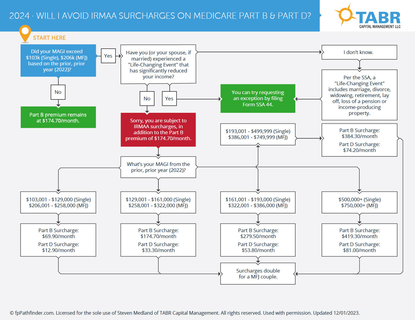 If you have questions about IRMAA or need help with Form SSA-44, please reach out to us. We’ve successfully assisted many clients in navigating these issues and are here to help you too. Call or email us to discuss how we can help you manage your Medicare costs effectively. You’re also welcome to explore the flowchart below, which will help you determine whether or not you’re subject to IRMAA surcharges and how to potentially eliminate them.